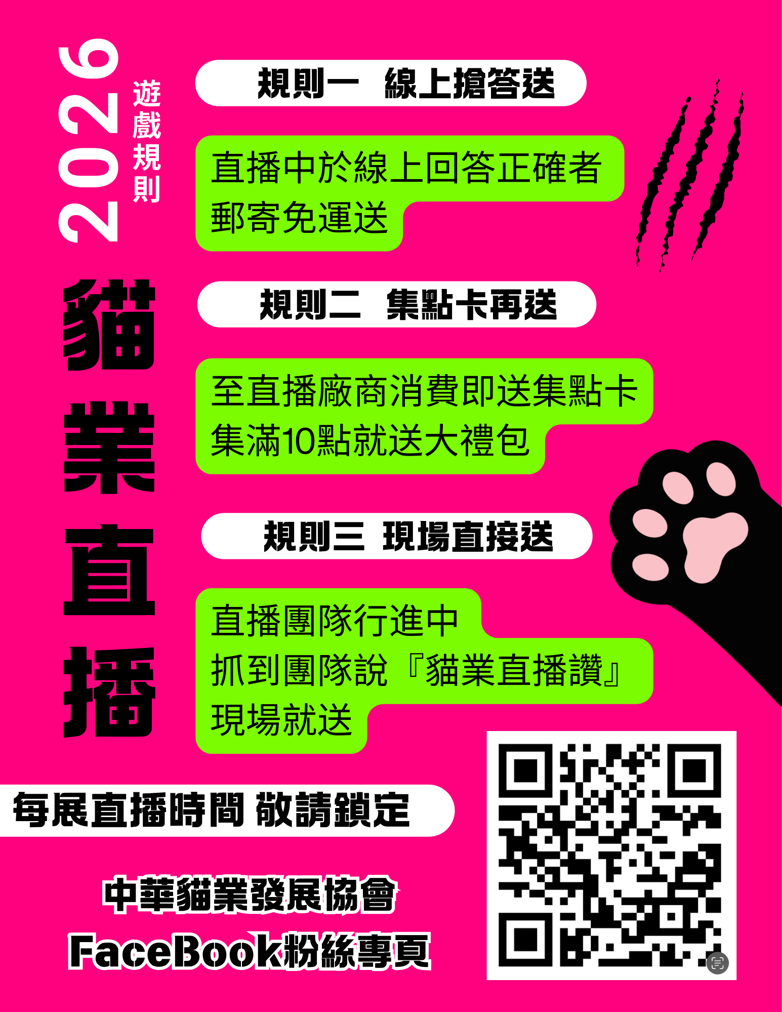 🎉 貓業直播活動辦法如下 欲參加之廠商請洽所屬業務報名 詳細說明請參照展覽及粉專規定 🐾 集點卡集點活動請認明張貼此招牌直播廠商 ✔ 請認明現場張貼【直播合作廠商】標示 ✔ 僅限合作直播攤位可集點未張貼招牌之直播不列入活動 ✔集點卡可累積於每次由中華貓業發展協會舉辦之寵物展使用 注意事項 遊戲規則請依中華貓業發展協會直播活動公告為主。 得獎者請主動私訊粉絲專頁提供郵寄資訊與地址。 👉 前往官方粉絲專頁 看最新公告及直播